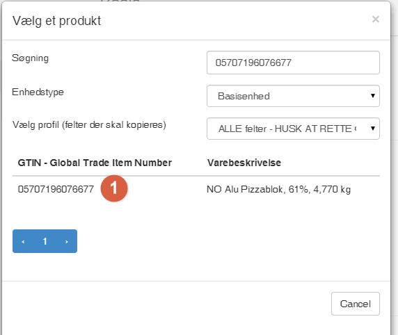Once the product to be copied from is found, click on GTIN (1).