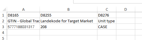 Note! Be aware of fields D8249 (GTIN for the next lower unit) and D8270 (Quantity of the next lower unit) if changing from "CASE" to "BASE_UNIT_OR_EACH" - these fields must be removed from the product document before the Excel sheet is uploaded.